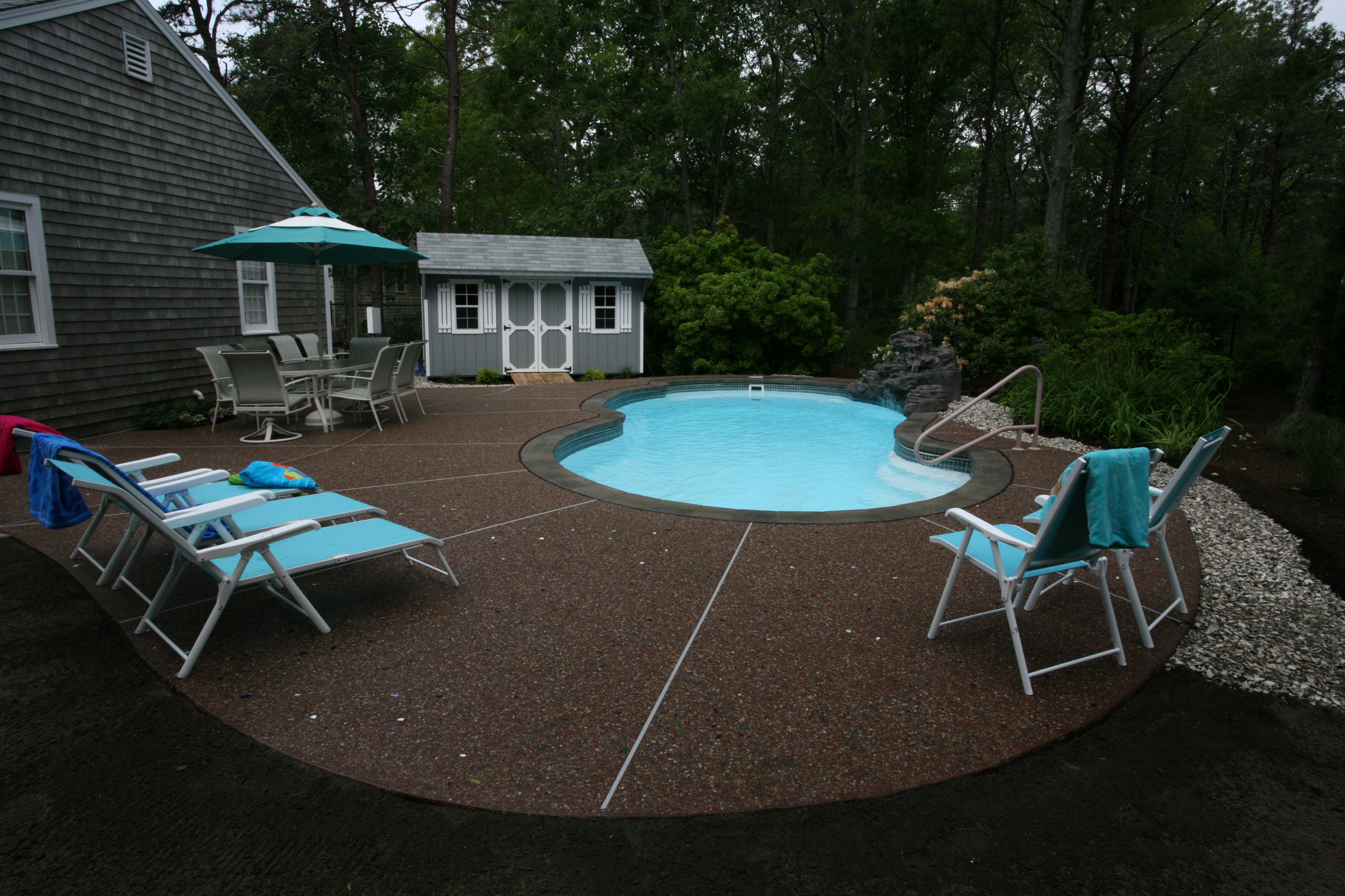 I love the use of the Saftron Crossbraced rail. Such a cozy backyard. The rocks on the edge of the pool tie into the surroundings.